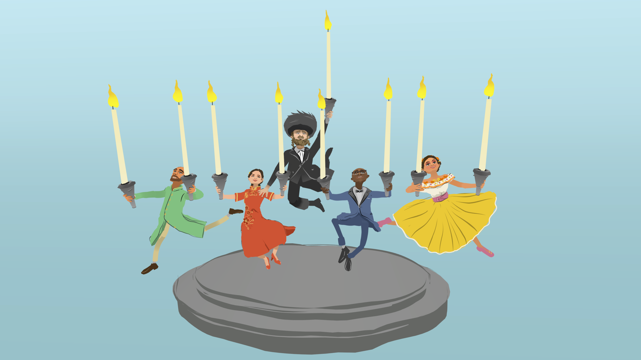 A Historic Menorah is brought to life in AR by animating the characters each holding a candle in their hands and dancing a traditional dance together.